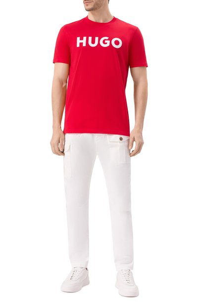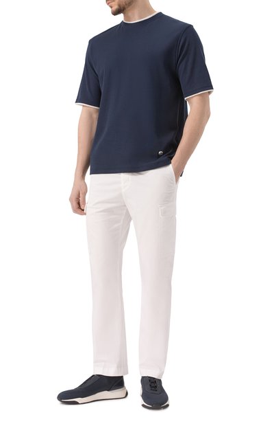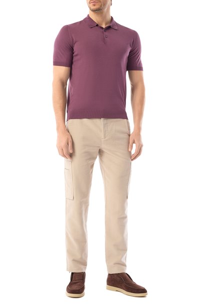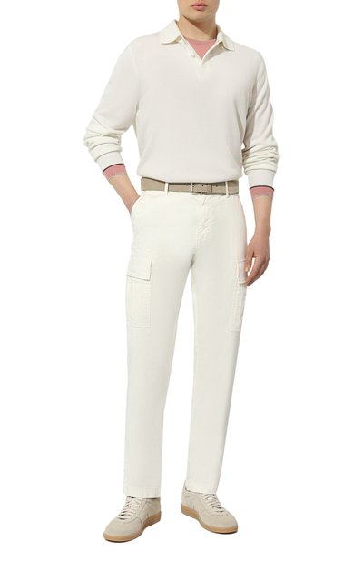 Брюки со вставками в области колен выполнили из хлопка. Модель дополнили боковыми карманами, двумя задними и карго с клапанами, а сзади под поясом с регулируемыми ремешками расположили фирменную строчку.