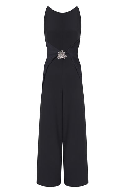 Комбинезон из крепа на основе ацетата и шелка дополнили завязками на талии, подчеркнув их акцентными металлическими цветами. На спинке модели предусмотрели узкий вырез, который фиксируется пуговицей сверху и лентами.