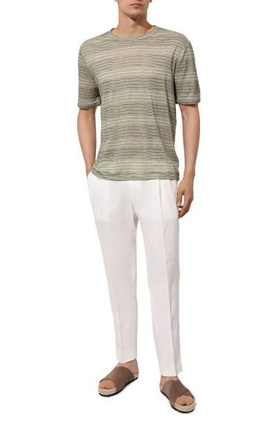 Футболку выполнили из льняного трикотажа, окрашенного в процессе производства. Единственным декором модели сделали небольшую вышивку под горловиной сзади.