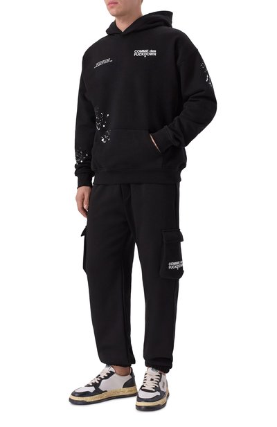 Джоггеры-карго с эластичным поясом-кулиской выполнили из хлопка с добавлением полиэстера. Один из четырех карманов модели украсили контрастным логотипом бренда.