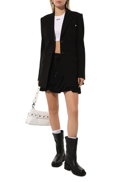 Для пошива приталенного однобортного жакета с множеством вытачек на спинке использовали шерстяной твил. Модель дополнили боковыми карманами с клапанами и прорезным нагрудным, украшенным серебристой пластиной с эмблемой марки.