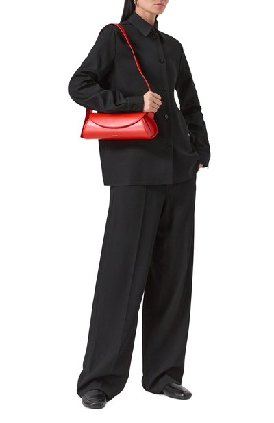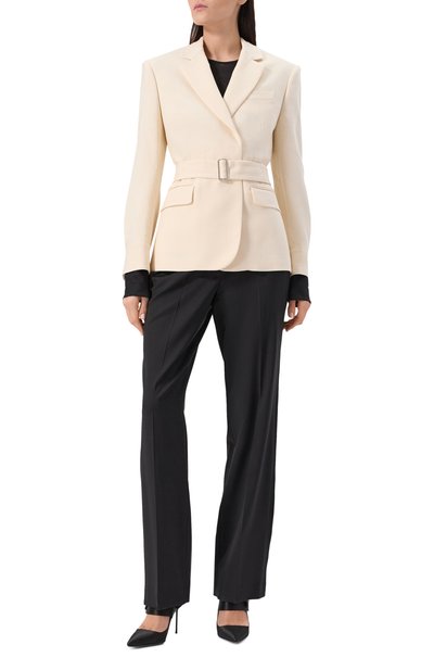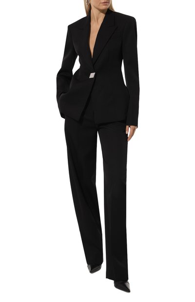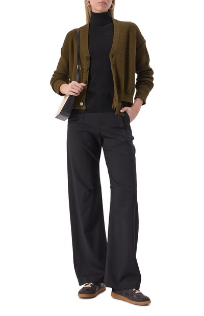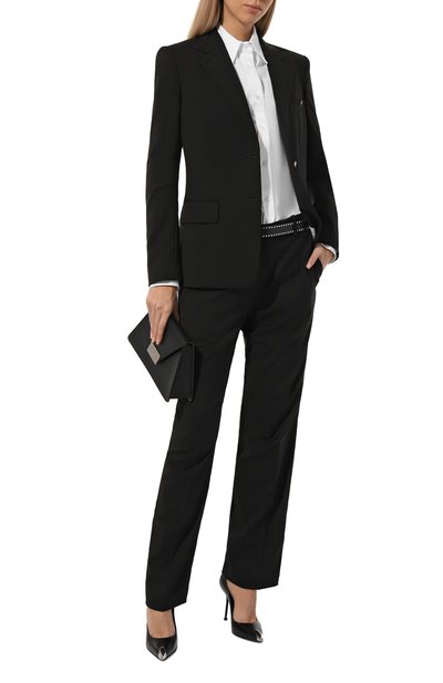 Брюки со стрелками выполнили из шерсти. Один из четырех врезных карманов изделия украсили брендированной пластиной. Модель дополнили широким поясом-резинкой с логотипами марки.