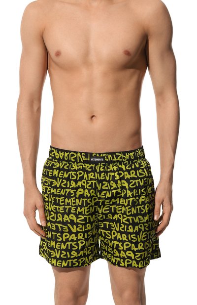 Плавки-шорты сшили из быстросохнущего полиэстера с фирменным паттерном. Модель с задним накладным и боковыми карманами дополнили регулируемым поясом-кулиской.