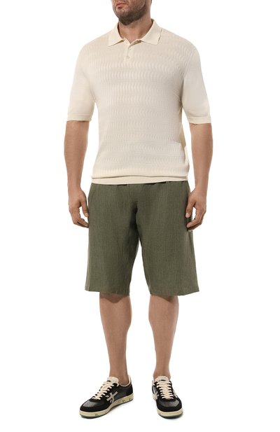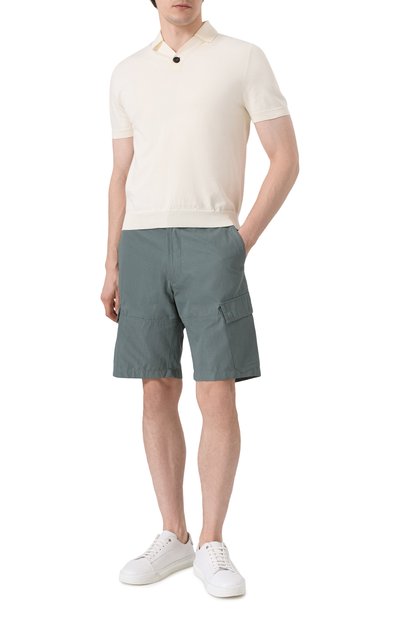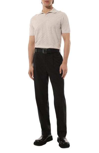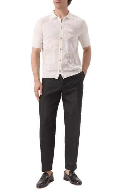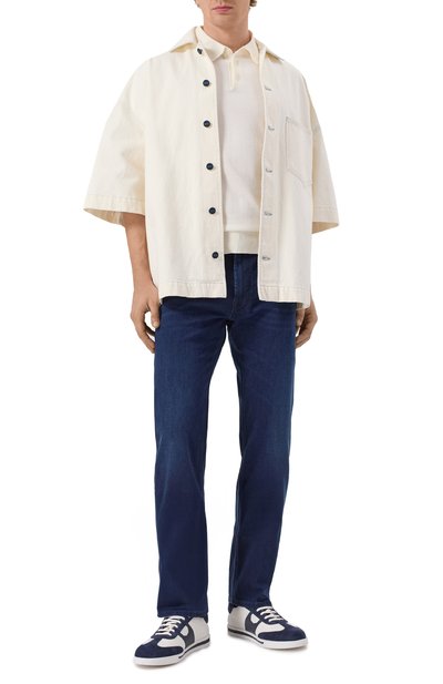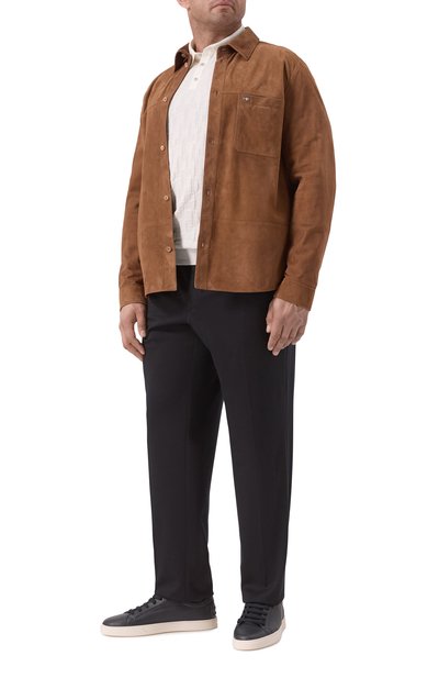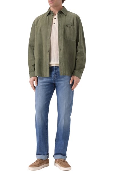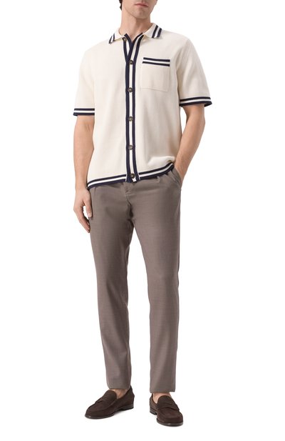 Рубашку с нагрудным накладным карманом выполнили из шерстяного трикотажа с добавлением шелка. Модель застегивается контрастными пуговицами.