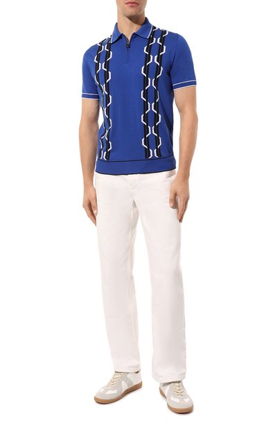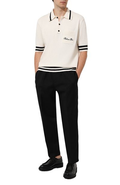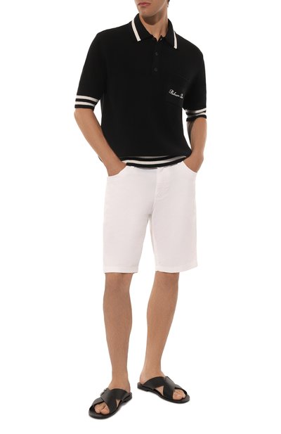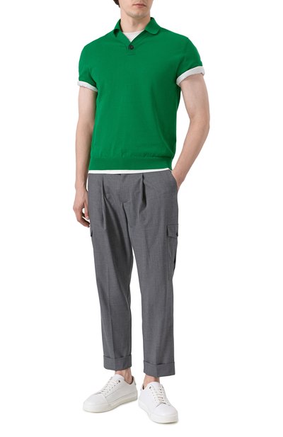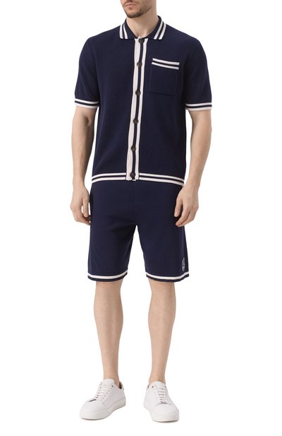 Рубашку прямого кроя сшили из хлопкового трикотажа в рубчик, а края подчеркнули контрастными полосками. Эластичная модель с нагрудным карманом застегивается пуговицами.