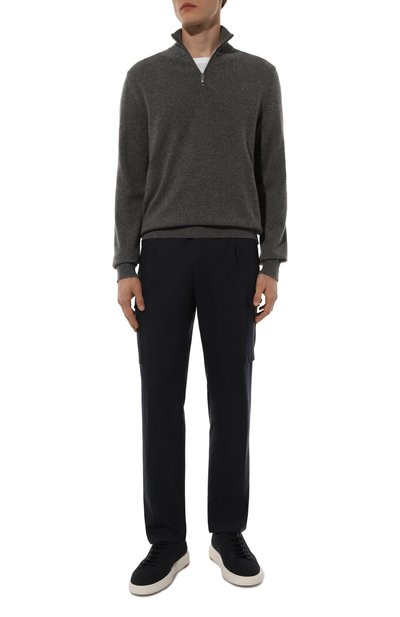 Брюки с защипами и четырьмя карманами выполнили из тонкой костюмной шерсти. Модель с брендированной пуговицей фирменного алого оттенка украсили ярлыком, а эластичный пояс с потайной кулиской — патчем с вышитой точкой.