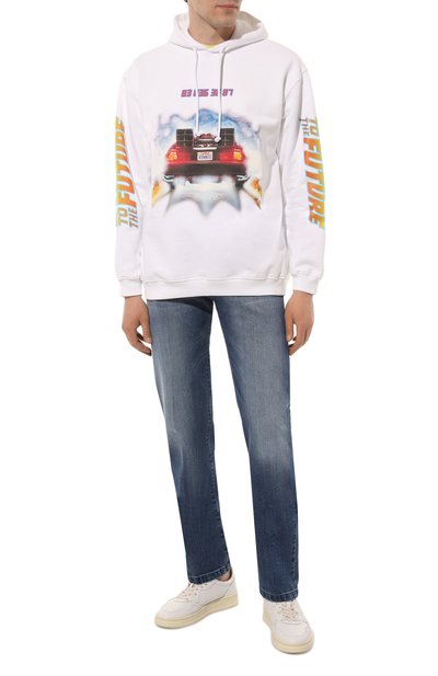 Выбеленные джинсы с застежкой button fly выполнили из эластичного хлопкового денима. Модель с брендированным жакроном на поясе сзади украсили логотипом на шлевке и эмблемой на самом маленьким из пяти карманов, вышитыми нитью фирменного алого оттенка.
