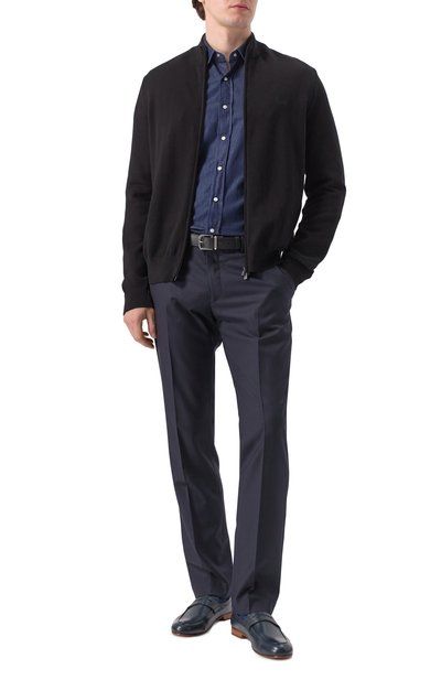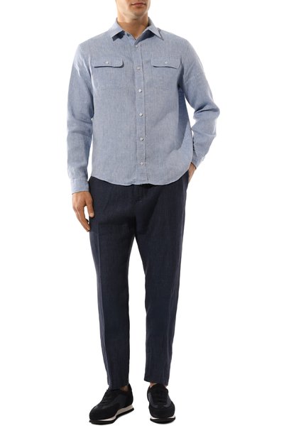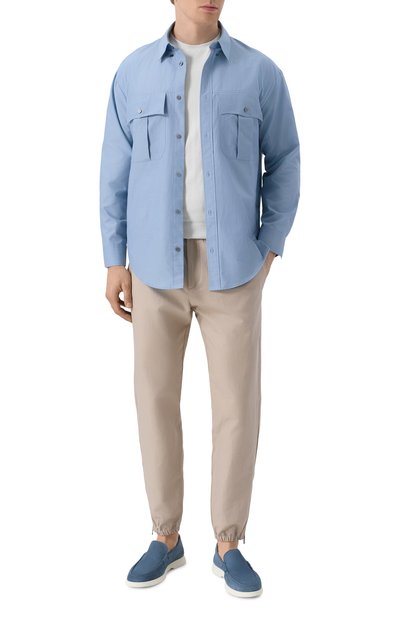 Рубашку с фигурными низом и кокеткой сшили из легкого денима. Модель на перламутровых кнопках дополнили накладными нагрудными карманами с клапанами.