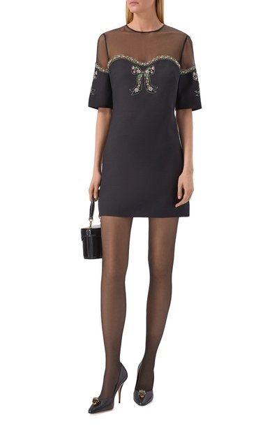 Платье с вырезом «лодочка» и спущенной линией плеч сшили из шелка Cady Couture с фирменным паттерном. Модель с потайной молнией на спинке можно носить и самостоятельно, и в комплекте с парными брюками.