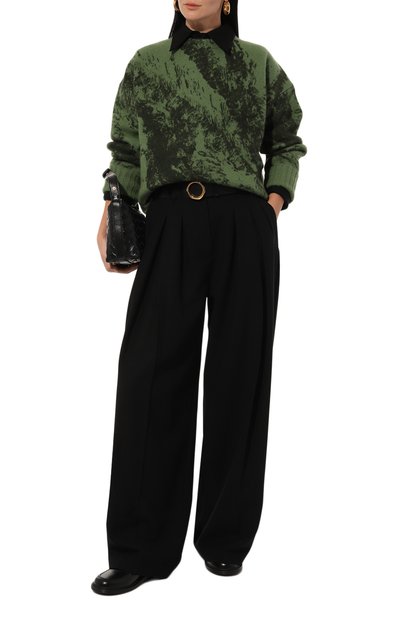 Брюки с двойными защипами и стрелками дополнили четырьмя карманами и съемным регулируемым ремнем, продетым в шлевки. Модель с атласными лампасами изготовили из костюмной шерсти.