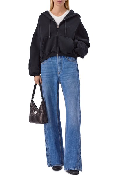 Толстовку на встречной молнии сшили из трикотажа френч терри на основе органического хлопка. Левый боковой карман декорировали брендированным ярлыком, а шнур в кулиске капюшона – кристаллами.