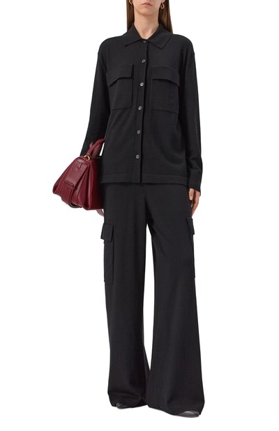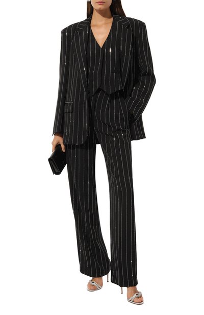 Для пошива брюк прямого кроя использовали полушерстяную ткань с серебристыми полосками. Модель с четырьмя врезными карманами дополнили атласными лампасам.