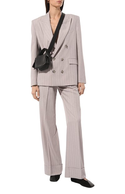 Двубортный жакет со шлицей сшит из полушерстяной ткани в полоску. Модель с внутренним и пятью внешними карманами украшена спереди нашивкой с геральдическим символом марки.