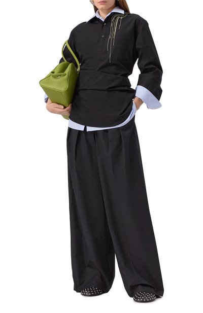 Брюки с высокой посадкой и стрелками сшиты из хлопка. Однотонная модель дополнена четырьмя врезными карманами и поясом со шлевками для ремня. Изделие без декора составит гармоничный дуэт с парным жакетом, пуловером и туфлями на каблуке.