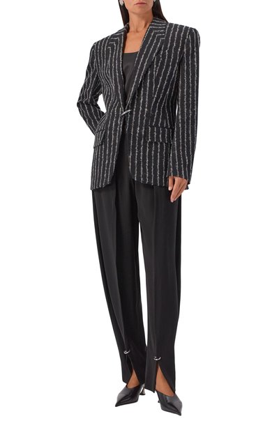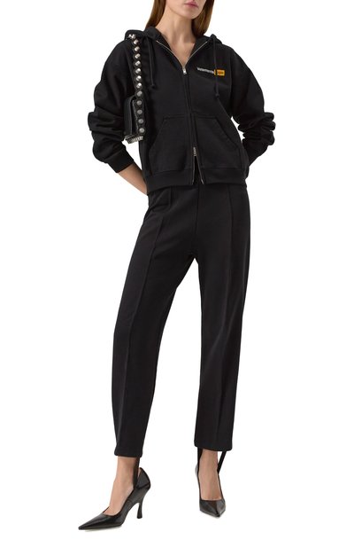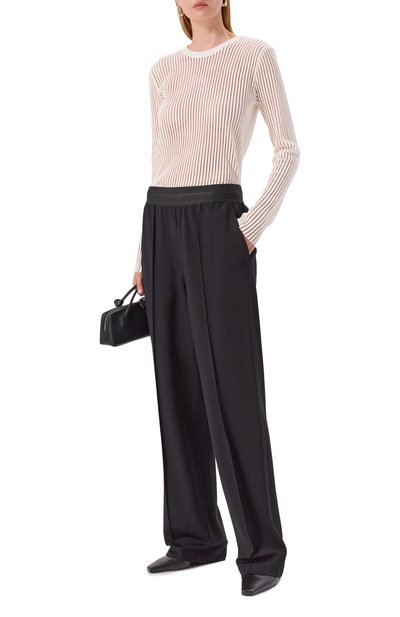 Брюки с высокой посадкой и стрелками сшиты из хлопка. Однотонная модель дополнена четырьмя врезными карманами и поясом со шлевками для ремня. Изделие без декора составит гармоничный дуэт с парным жакетом, пуловером и туфлями на каблуке.