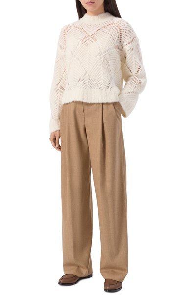 Укороченный пуловер с заниженной линией плеч связали из хлопковой пряжи. Модель с круглым вырезом, манжетами и широким поясом в резинку декорировали спущенными петлями.