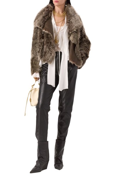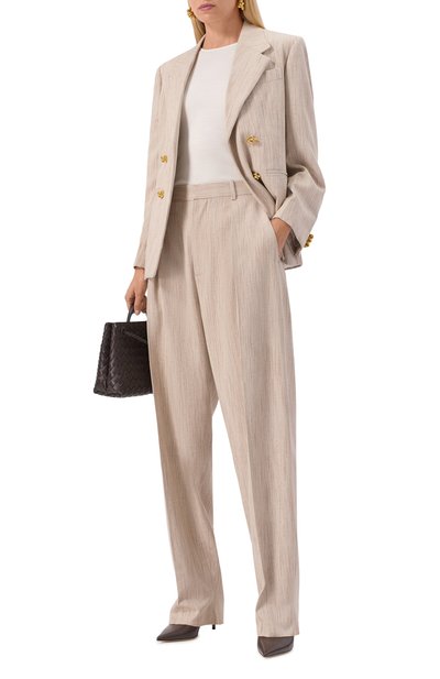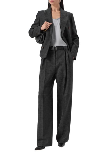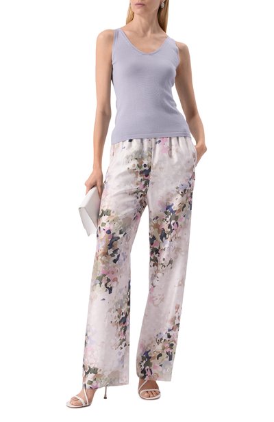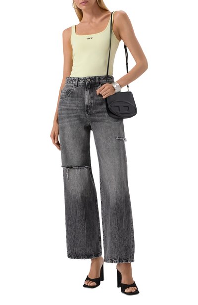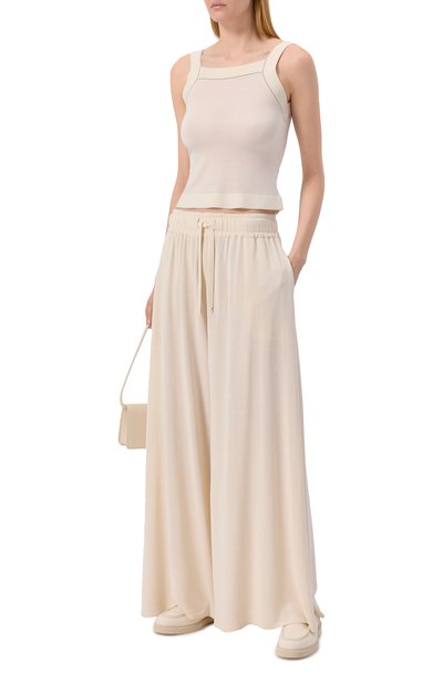 Укороченную майку с широкими бретелями изготовили из эластичного хлопкового трикотажа в рубчик. Кант вдоль V-образного выреза спереди и сзади подчеркнули цепочкой мониль.