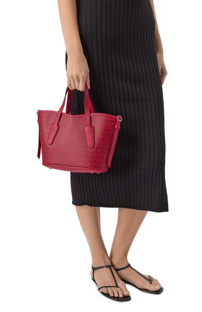 Сумку Amalia с магнитной кнопкой изготовили из обработанной на станках прочной зернистой кожи. Модель с двумя парами ручек разной длины дополнили внутри карманом на молнии и ремешками, позволяющими изменить форму. Спереди – фольгированный логотип бренда.