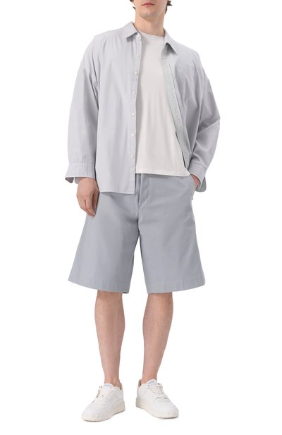 Для пошива шортов использовали смесовую ткань на основе хлопка с добавлением льна и шелка. Модель дополнена тремя парами карманов: боковыми, задними и карго. На принадлежность марке указывает брендированный патч из зернистой кожи.