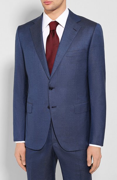 Костюм из тонкой шерсти дополнили семью наружными карманами, одним внутренним и отсеком для ручки. У пиджака с двумя шлицами сзади предусмотрели брендированный атласный подклад, а у брюк со стрелками сформировали небольшой разрез на поясе.