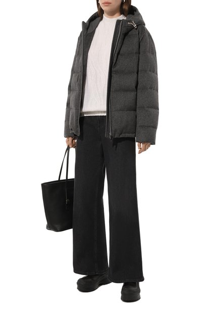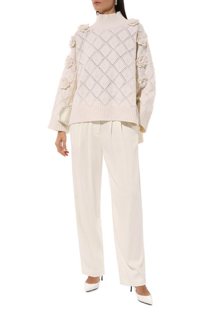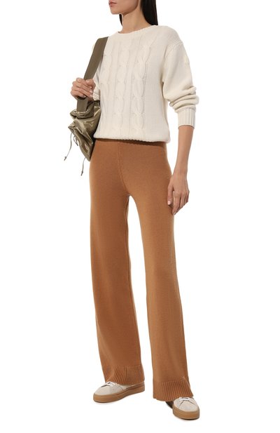 Для изготовления свитера с приспущенной линией плеч использовали хлопок. Спереди и на рукавах модель украсили кружевными вставками в тон.
