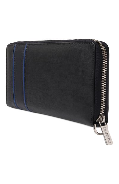 Небольшое портмоне с тисненым логотипом изготовили из гладкой матовой кожи, окрасив материал внутри в фирменный оранжевый оттенок Arancio Santoni. Аксессуар с тремя отделениями застегивается молнией.