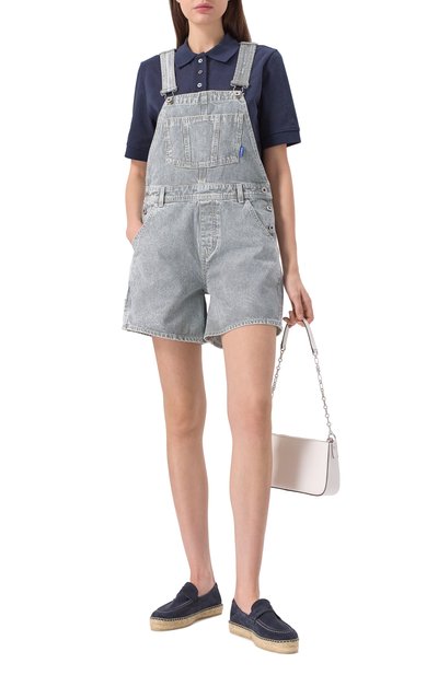 Выбеленный джинсовый комбинезон с регулируемыми бретелями дополнили двумя боковыми карманами, парой задних и нагрудным. Модель из денима средней плотности застегивается брендированными болтами.