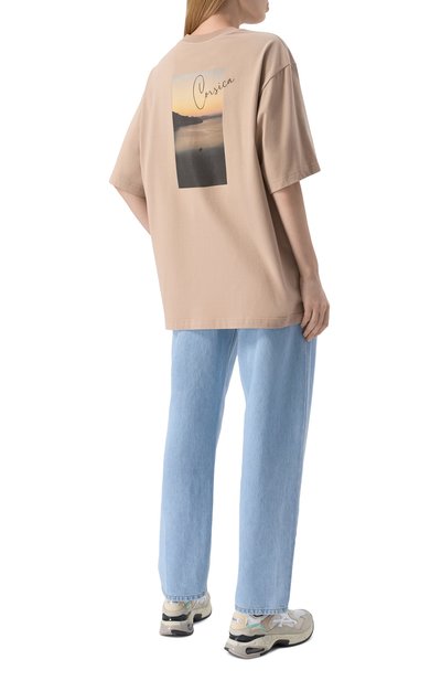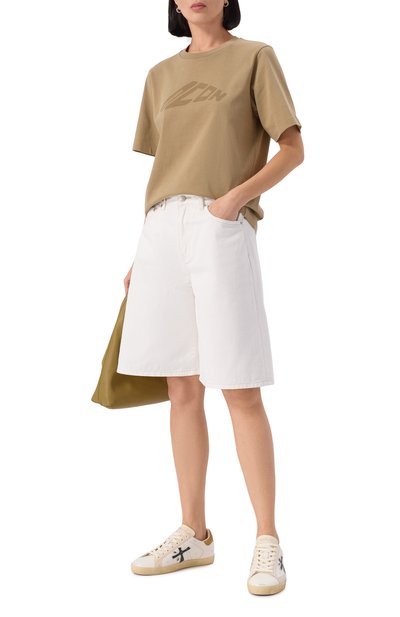 Футболку с широким кантом в рубчик на круглой горловине выполнили из хлопкового джерси. Спереди модель украсили небольшой эмблемой, вышитой нитью в тон.