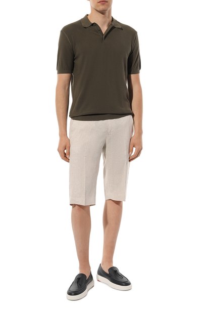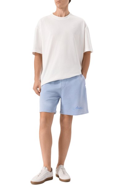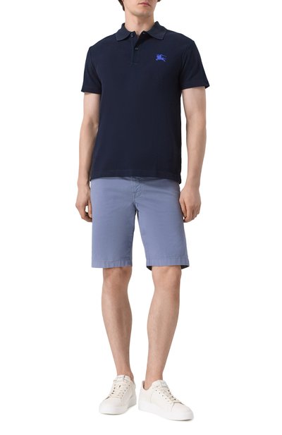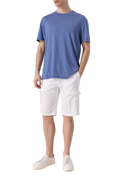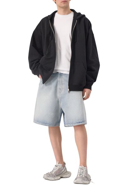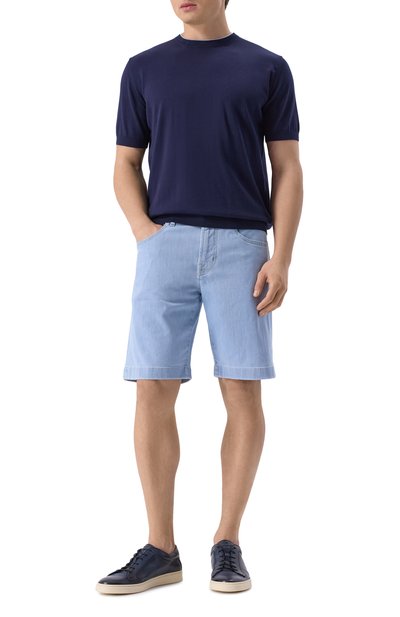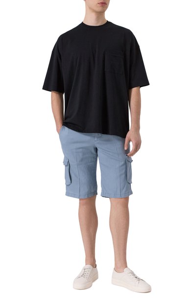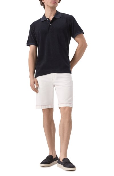 Шорты с пятью карманами, прошитые яркими строчками, выполнили из стрейчевого денима с добавлением льна. Выбеленную модель украсили вышитой эмблемой сбоку и кожаным брендированным патчем сзади. В комплекте – хлопковый платок.