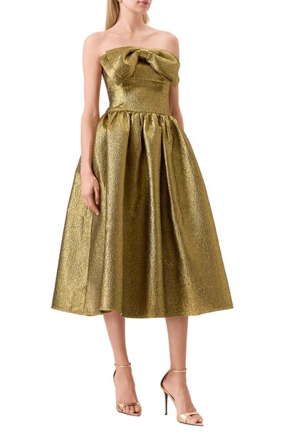 Короткое платье-бюстье с пышным подолом выполнили из полиэстера. Модель с завышенной линией талии и боковыми карманами застегивается потайной молнией сзади.