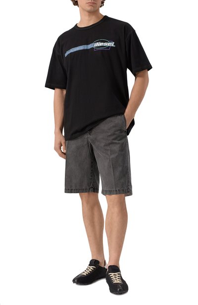 Для пошива шортов с брендированной надписью спереди и нашивкой над карманом сзади использовали выбеленный хлопковый футер. Модель с необработанными краями дополнили эластичным поясом-кулиской, в который продели шнур с рваной бахромой.