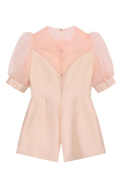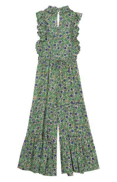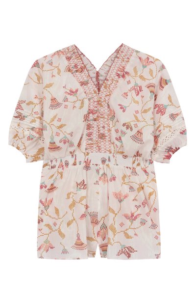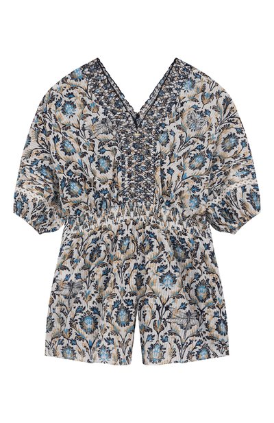 Комбинезон с драпированными короткими рукавами и фигурным воротником выполнили из вискозы с брендированным цветочным принтом. Модель с эластичной вставкой на поясе застегивается четырьмя пуговицами на нагрудной планке.