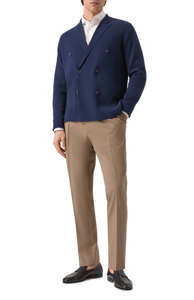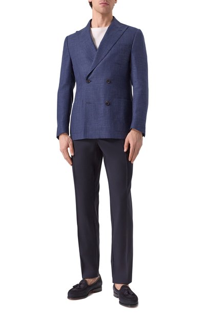 Двубортный пиджак P-Hanry с прямоугольными лацканами сшили из эластичной льняной ткани с добавлением вискозы. Модель с двумя шлицами дополнили нагрудным прорезным и парой накладных боковых карманов.