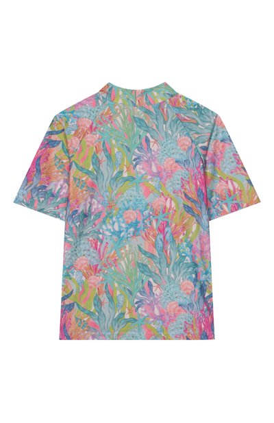 Футболку для плавания сшили из быстросохнущего переработанного полиэстера с принтом пейсли. Модель с круглой горловиной и широкими рукавами реглан защищает от ультрафиолета.