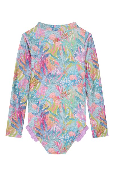 Слитный купальник с молнией спереди и длинными рукавами выполнили из быстросохнущего переработанного полиэстера с принтом Wildflower. Модель с оборками вдоль вырезов для ног обеспечивает защиту от ультрафиолета.
