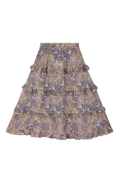 Многоярусную юбку с оборками выполнили из хлопковой ткани с принтом Dream Weaver. Эластичный пояс модели дополнили лентой, продетой в шлевки.