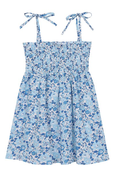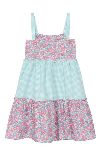Хлопковое платье с мотивом Coral Dreams дополнили кисточками на бретелях-завязках. Модель с гофрированным лифом украсили узкими оборками на многоярусном подоле.