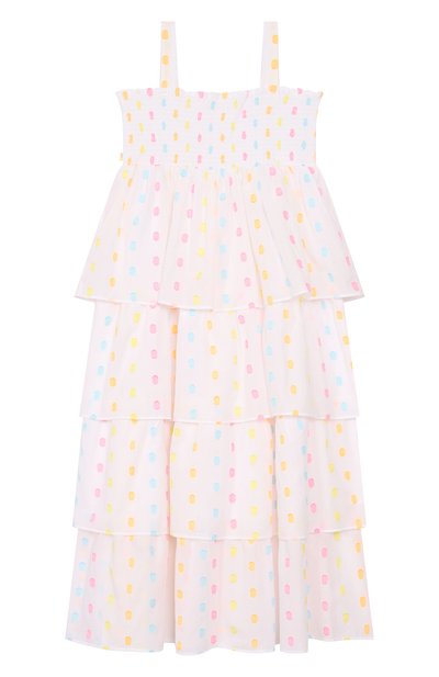 Хлопковое платье с мотивом Coral Dreams дополнили кисточками на бретелях-завязках. Модель с гофрированным лифом украсили узкими оборками на многоярусном подоле.