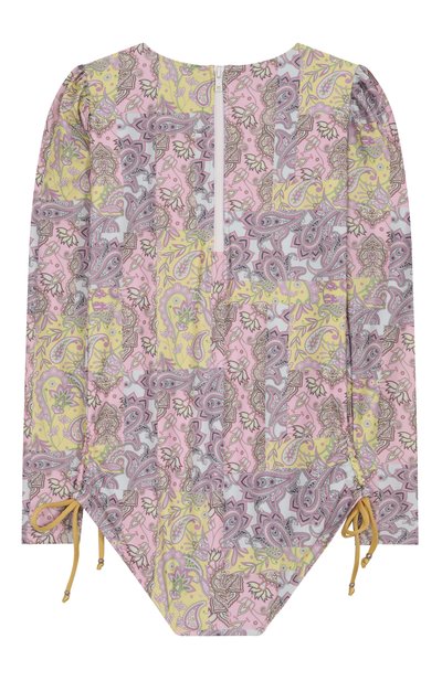 Слитный купальник из эластичного вторичного полиэстера застегивается молнией в тон на спинке. Модель с цветочным рисунком Adelaide дополнили однотонным подкладом, а по бокам предусмотрели кулиски с контрастными шнурами.