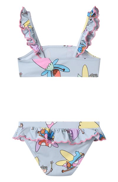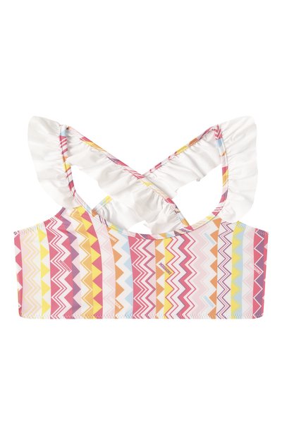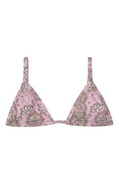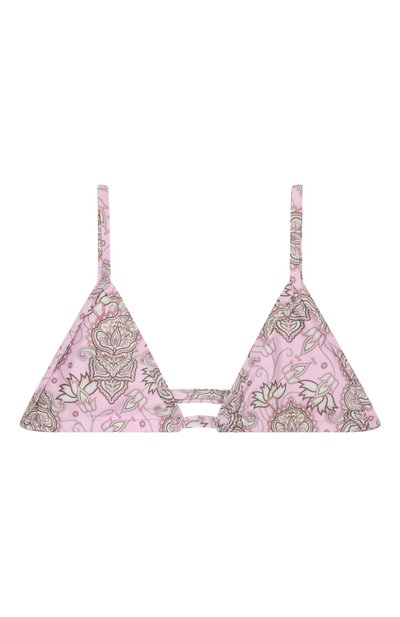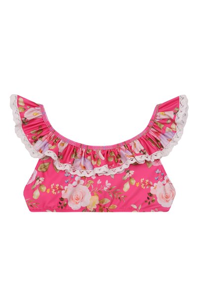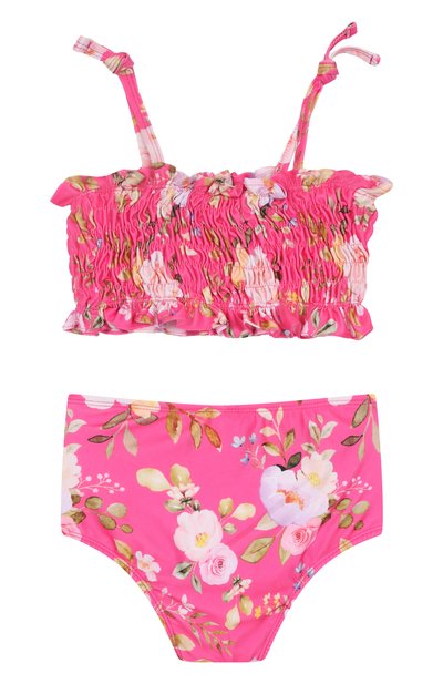 Раздельный купальник выполнили из стрейчевого переработанного полиэстера с цветочным мотивом Edith. Плавки с высокой посадкой оставили без декора, а бра-топ с регулируемыми Y-образными бретелями украсили оборкой с кружевным кантом.