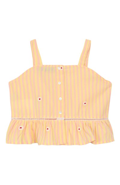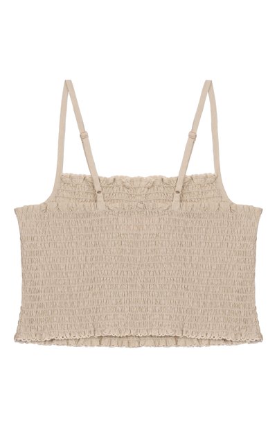 Топ с рюшами по краю выполнили из вискозы с добавлением льна. Модель дополнили бретелями в тон, которые перекрещиваются сзади.