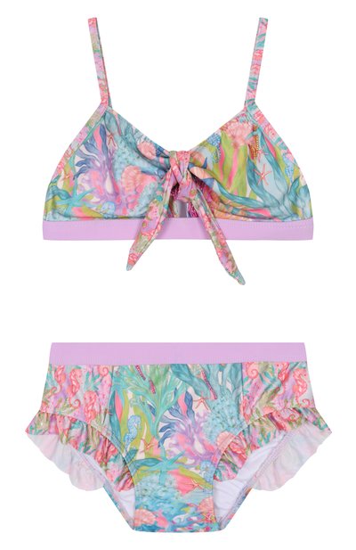Для пошива раздельного купальника использовали полиэстер стрейч с принтом Coral Dreams, который подчеркнули ручной вышивкой бисером. Посадку плавок можно регулировать вертикальными боковыми кулисками, а бра-топа — бретелями, которые переплетаются сзади.