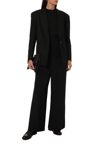Широкие брюки Trenton с заниженной линией шага и глубокими встречными складками спереди выполнили из тонкой шерстяной ткани tropical. Модель с регулируемым поясом-кулиской дополнили боковыми карманами и прорезным задним.