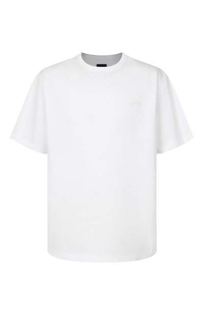 Футболку свободного кроя сшили из хлопкового джерси. Спереди модель украсили вышитым нитью в тон небольшим логотипом, а на спинке – принтом по мотивам работ американского фотохудожника Кима Кивера.