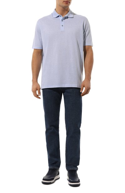 Поло с рифлеными манжетами и поясом изготовили из хлопкового трикотажа. Внутреннюю пуговичную планку изделия укрепили льняной текстильной накладкой с клетчатым мотивом, а низ дополнили фирменной нашивкой.