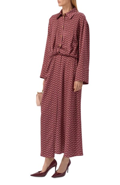 Платье-рубашку со спущенной линией плеч, фигурным асимметричным низом и складкой сзади выполнили из шелка. Модель на перламутровых пуговицах дополнили накладным нагрудным карманом.