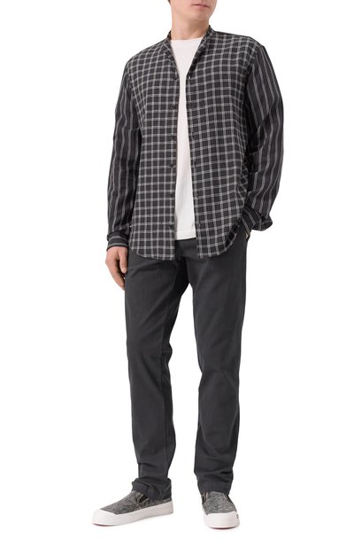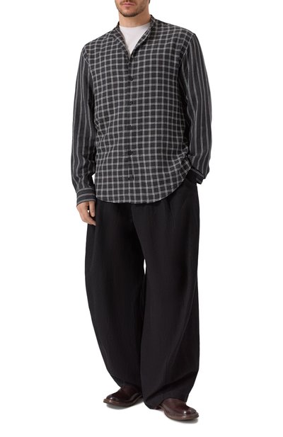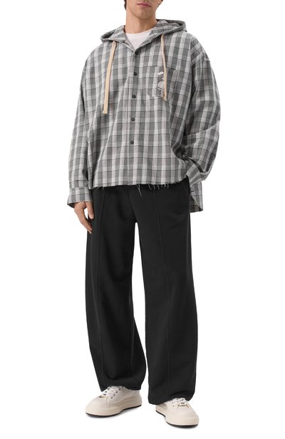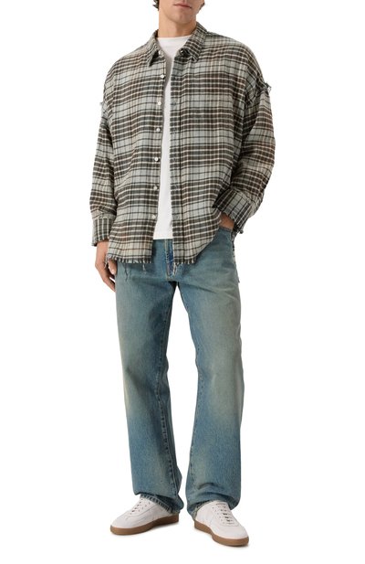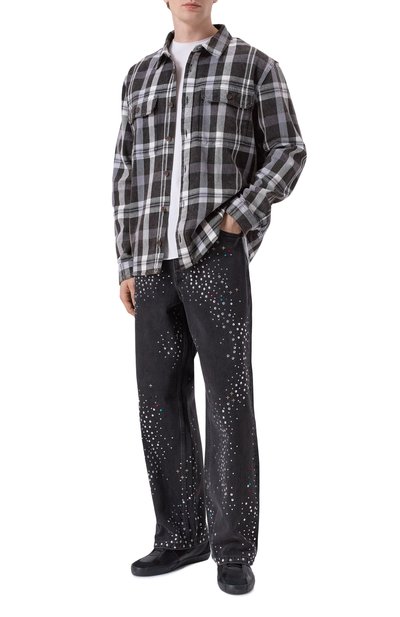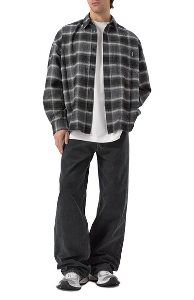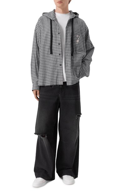 Для изготовления oversize-рубашки с вышитым логотипом спереди и аппликацией-эмблемой на спинке использовали смесовую ткань с разными клетчатыми мотивами. Необработанные края и выведенные наружу швы придают модели небрежный вид.