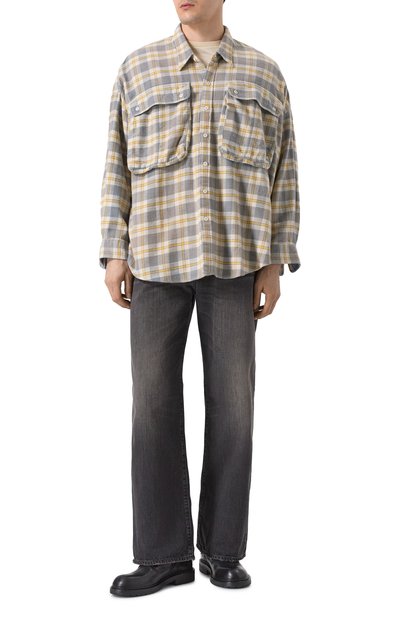 Клетчатую рубашку с необработанными краями сшили из фланели на основе полиэстера и хлопка. Нагрудный карман украсили вышитой эмблемой марки, а на спинке разместили крупный логотип. Модель свободного кроя дополнили регулируемым капюшоном.