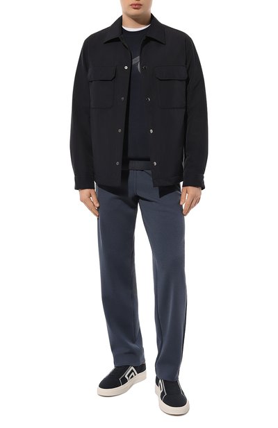 Брюки с эластичным поясом-кулиской сшили из хлопкового твила с добавлением шелка и шерсти. Модель дополнили задним и боковыми карманами.