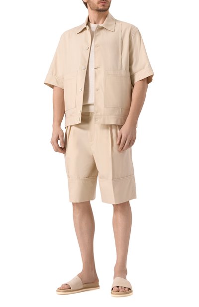 Рубашку с рельефными швами сшили из плотного хлопка с добавлением шелка и шерсти. Модель с накладными боковыми карманами застегивается пуговицами в тон.